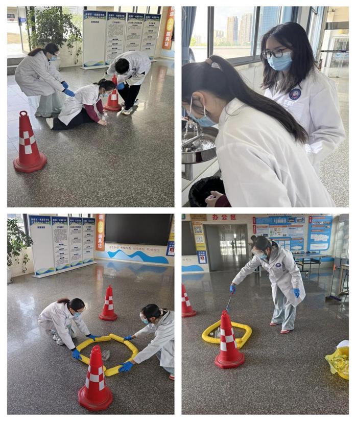 上午10时30分,应急演练正式启动。第一个场景模拟有机试剂泄漏:实验人员在拿取试剂过程中,不慎打翻盛装有机溶剂的试剂瓶,试剂快速扩散并伴有轻微挥发,路过人员发现后,第一时间撤离至安全区域,并迅速向实验管理员报告。接到报告后,应急处置小组在赵钦书记和应雪副院长的指挥下,快速穿戴好一次性丁腈手套、护目镜、实验服及KN95口罩等个人防护装备,携带防泄漏围吸附棉条、有机吸附棉、有害废物专用桶等处置工具赶赴现场,按照“控源-围堵-吸附-清理”的规范流程,先用水晶板临时封堵泄漏区域,再用吸附棉从外围向中心铺展吸收试剂,最后将吸附后的废棉妥善收集至专用有害废物桶,确保无试剂残留,整个处置过程快速、规范、有序,有效避免了泄漏试剂扩散引发的二次危害。